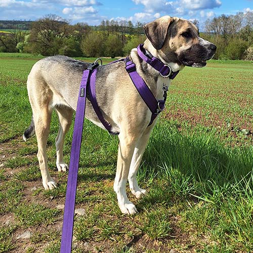 De riem is superzacht en lekker breed, glijdt niet meer uit je hand en je krijgt geen rode handpalmen meer. Ik heb hem voor mijn HSH-mix teefje en hij maakt zijn beloftes helemaal waar 😉 Ik heb de hele set en we zouden niets anders meer willen.